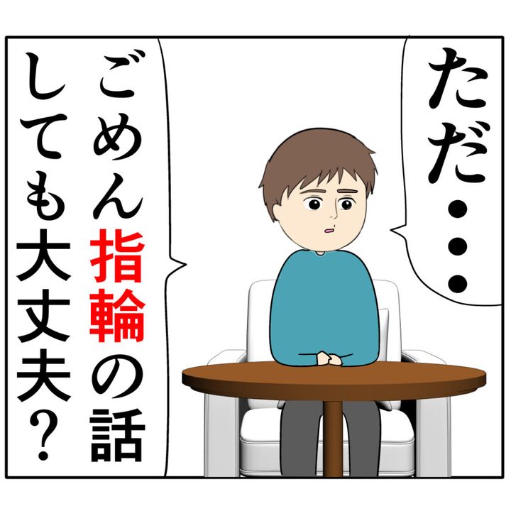 めいさんが離婚を選択するのなら受け入れると伝えた上で、自分にとって妻のめいさんと娘のあかりちゃんがどれほど大切な存在かということと、自分が今1番好きなのは元彼女のジュリ実さんではなくめいさんだときっぱり言い切ったろみ緒さん。続けて「ただ・・」と切り出すと、「ごめん。指輪の話しても大丈夫?」とめいさんに尋ねました。