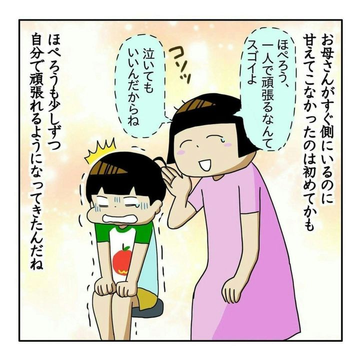 注射が大の苦手の ほぺろうくんは、毎回、大泣き&大暴れしていたそうです。それが、今回は一人でがんばることができましたね。ぼさ子さんも思わず涙ぐんでしまいますね。