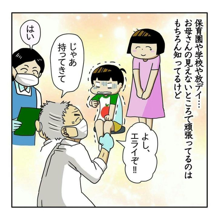 子どもは成長するにつれて、親の手を離れて過ごす時間が長くなりますよね。親が見ていないところで、子どもはがんばっているものです。そして今回、ぼさ子さんは予防接種の場面で、わが子が大きく成長した姿を見ることができました!