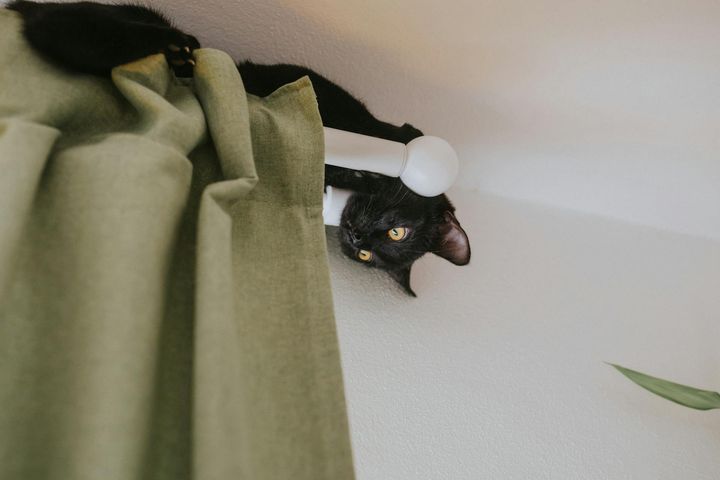 本日の美人猫は、高みのドヤ顔見物を決める黒猫さん。外には出ていないはずなのに、家の中には見当たらない、そんなシチュエーションで探す場所といえばここであります。カーテンレールの上は猫にとっての隠れ場所でもあり、アスレチックスポットでもあり、飼い主の困り顔を眺める絶好のポイントであります。