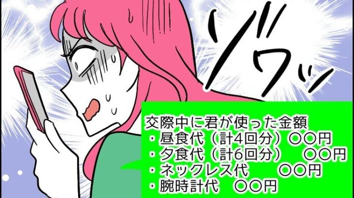 どんな言葉で返事をしたらいいか悩んでいると、また元彼からメッセージが届きました。そのメッセージには、交際中に元彼が支払ってくれた食事の金額やデートでかかった費用が羅列されていたのです。コンビニで「いいよ、俺が奢るよ」と言ってくれたコーヒーや、ちょっとしたスイーツの代金も細かく記載されていて……。