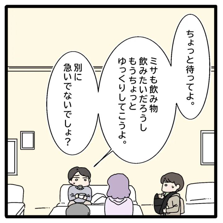 義母が立ちあがったのを見て「ちょっと待ってよ。ミサも飲み物飲みたいだろうし、もうちょっとゆっくりしていこうよ。別に急いでないでしょ?」と急かす義母を止めてくれました。