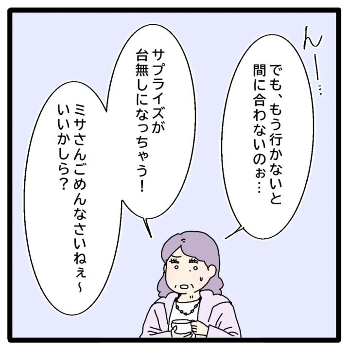 義母は困ったように「でも、もう行かないと間に合わないのぉ」と言って、今すぐにでも出発したい様子です。だから、どこへ!?「サプライズが台無しになっちゃう!ミサさん、ごめんなさいねぇ~、いいかしら?」嫌とは言えない雰囲気で義母に言われ、私は飲み物を諦めるしかありませんでした。私だってゆっくりしたかったけど。