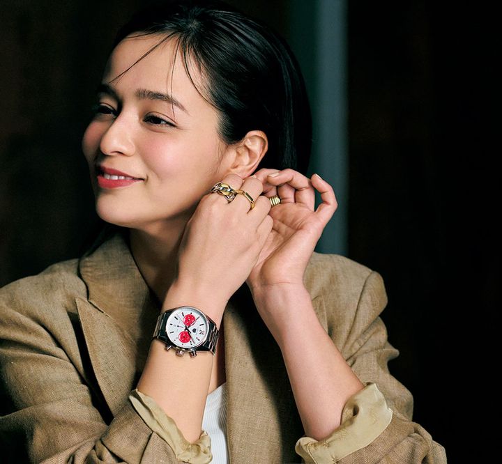 TAG Heuerの「カレラ」は、日の出の太陽から着想を得た「赤」を取り入れたキャッチーな文字盤が印象的なクロノグラフ。日本の伝統色の赤と白が織りなす静謐な美を讃えたデザインと高精度機能を備えたムーブメントは自分軸をしっかりと持つ女性像を感じさせてくれます。