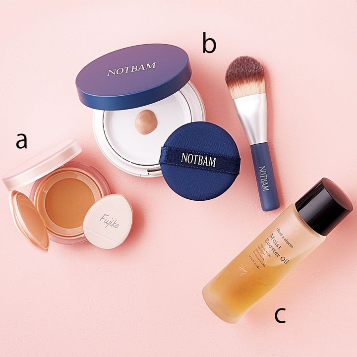 a.フジコ お直しパクト 01 ¥1,980 (かならぼ) b.NOTBAM VEGAN グロウパレットファンデーション クリアベージュ ¥8,250 (BLAIR. ) c.モイスト ブースターオイル 40ml ¥3,520 (チャントアチャーム)