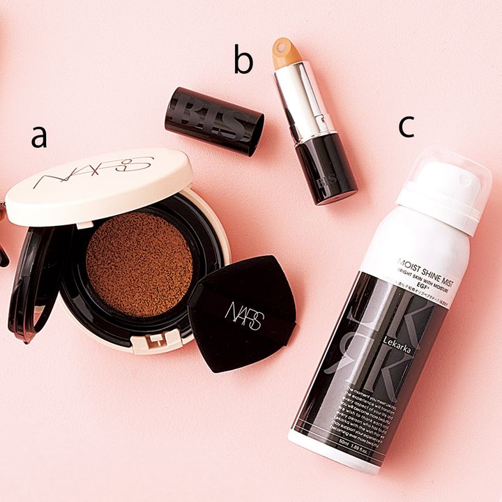 a.ピュアラディアントプロテクション アクアティックグロー クッションファンデーション 00510 ¥7,350 (セット価格)(NARS JAPAN) b.BISOU エンハンシングスティック N〈アンバー〉¥4,070 (BISOU LOOP blue.Inc) c.ミニブライトリーモイストシャインミスト 50ml ¥5,500 (レカルカ)