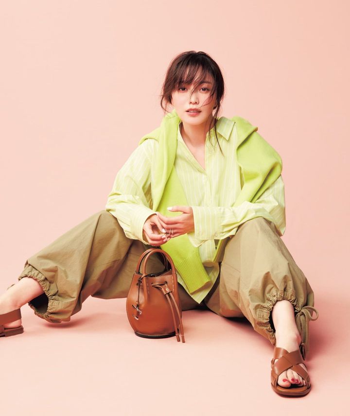 シャツ¥8,910※6月上旬入荷予定 肩に巻いたニット¥9,460(ともにミラ オーウェン/ミラ オーウェン ルミネ新宿2店)パンツ¥46,200(レスギアトリエ/サードマガジン)バッグ¥223,300サンダル¥135,500(ともにトッズ/トッズ・ジャパン)右手リング¥59,400左手リング〈付け根側〉¥110.000〈指先側〉¥110,000(すべてノアーク/ノウン)