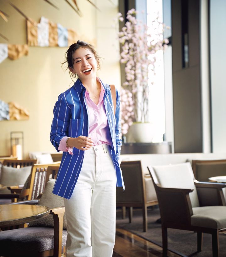 春を感じるピンクシャツにジャケット見えするブルーのストライプシャツを羽織った最旬甘ニッシュが新鮮。一年で最も「好感」を意識する春こそ、甘さで親しげな印象と、きちんと感で信頼感を。