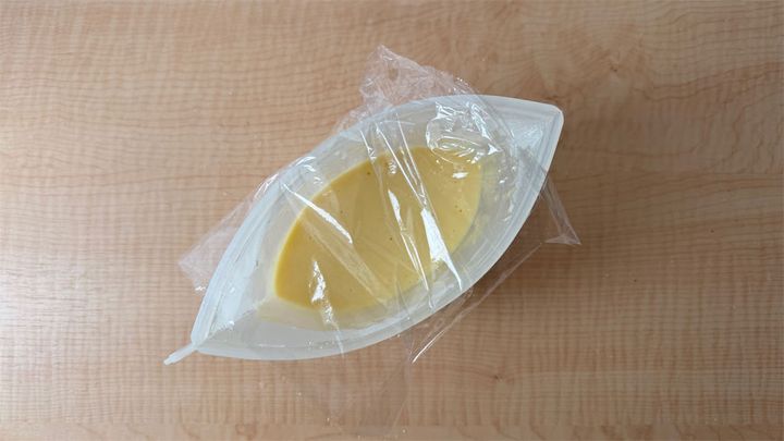 4.容器の両端をふさがないようにふんわりとラップをかけ、600Wの電子レンジで3分加熱する。