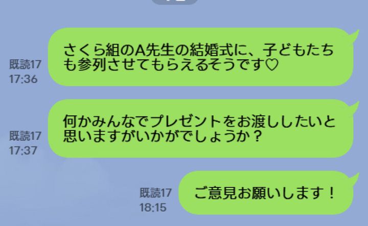 3. 「何かプレゼントしませんか?」担任の先生の結婚祝いを保護者グループLINEで発案した私。まさかの反応に絶句!