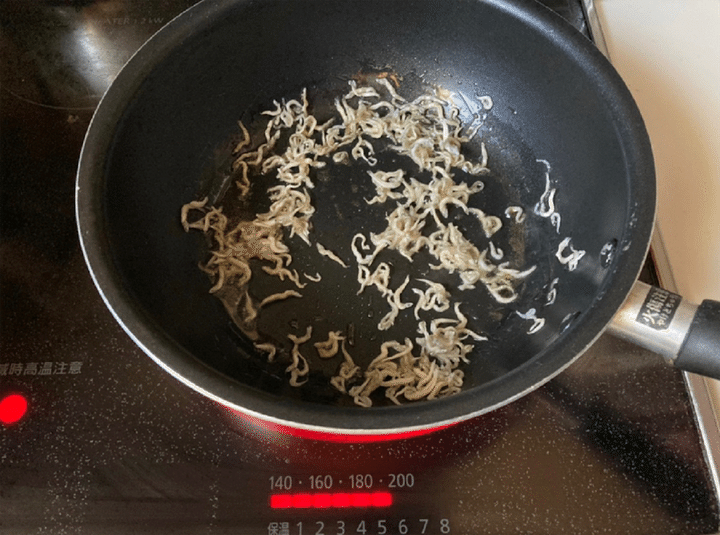 フライパンに、ちりめんじゃことゴマ油を入れ強火で加熱する。