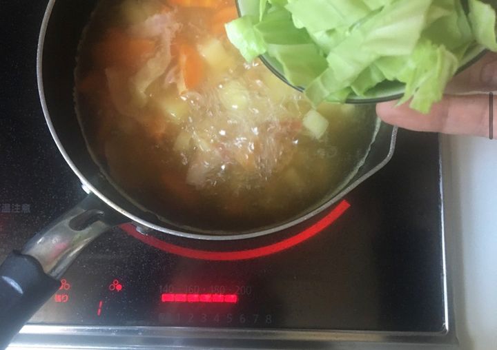 鍋にじゃがいも、にんじん、ベーコン、水、コンソメを入れ強火で加熱し、沸騰したらマカロニを入れ、しばらくグツグツ煮る。じゃがいもやにんじんに火が通ったらキャベツを入れ、1分ほど煮れば完成!