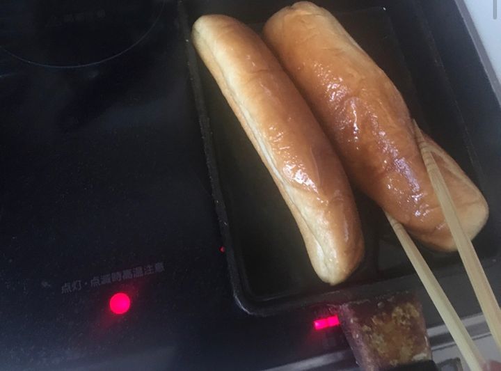 フライパンに油を5mmほど入れ、160℃に熱する(フライパンを傾けて菜箸を入れ、細かい泡が出たらOK)。ロールパンを入れて30秒ほど揚げ焼きにする。