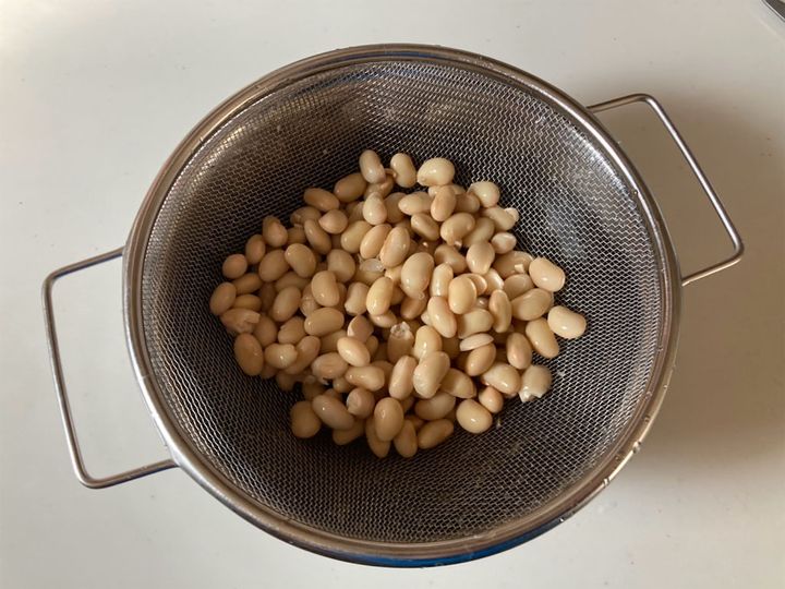 大豆の水煮は水洗いし、ザルにあげて水気をよく切る。
