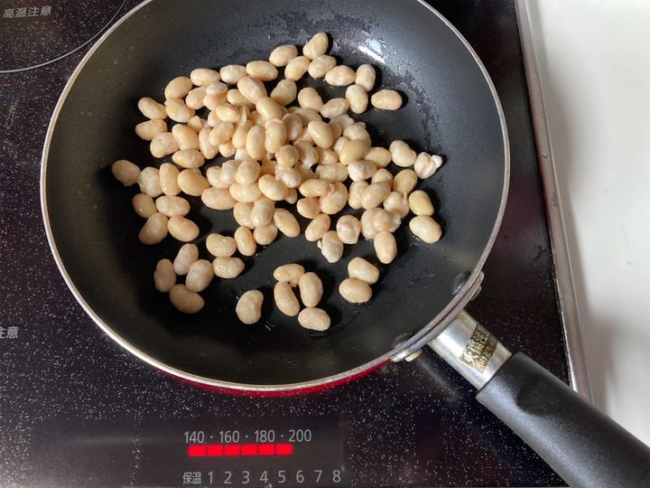 油を熱したフライパンに片栗粉をまぶした大豆を入れ、強火で加熱する。