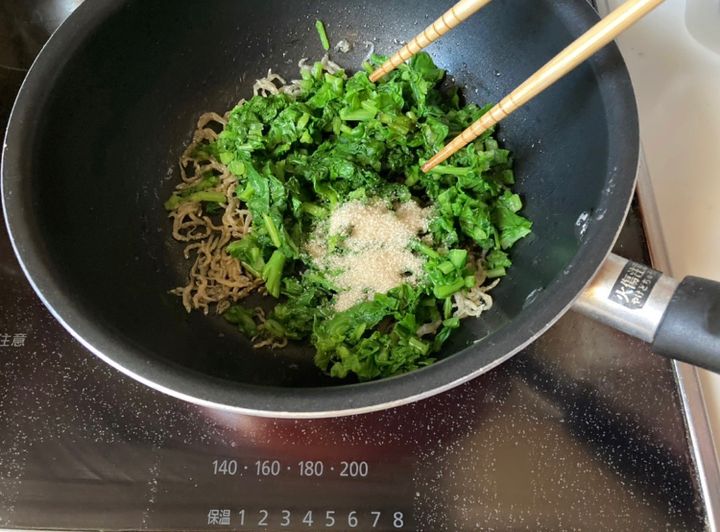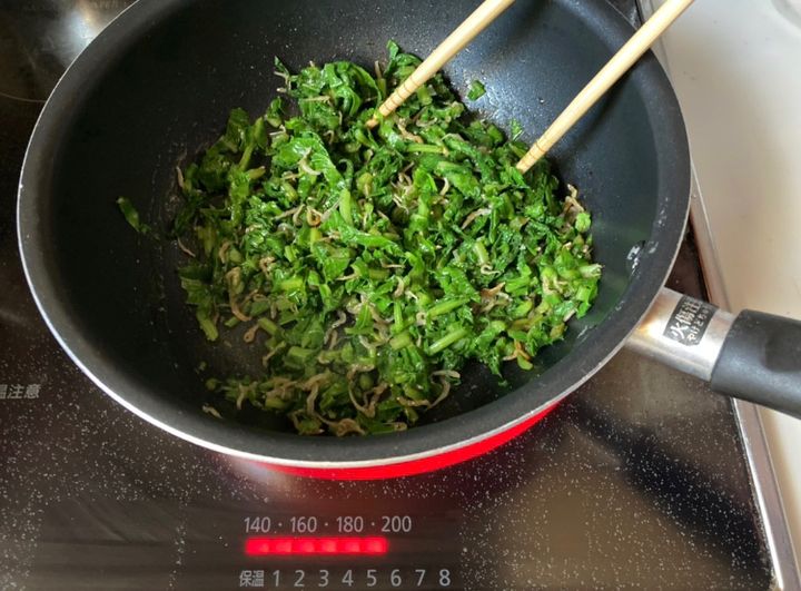 ちりめんじゃこがカリカリになったら火を止め、大根葉と砂糖、濃口しょうゆを入れて混ぜ合わせる。