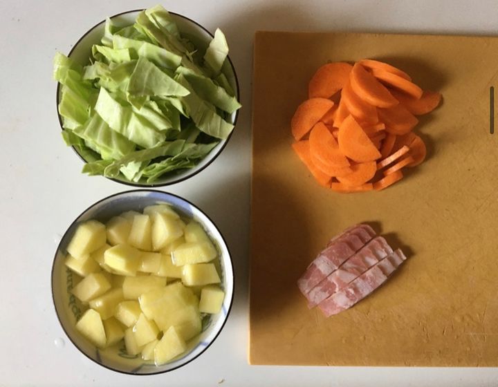 じゃがいもは皮を剥きひと口大に切り水にさらし、キャベツは1cm幅のざく切り、にんじんは皮を剥き薄い半月切り、ベーコンは1cm幅に切る。