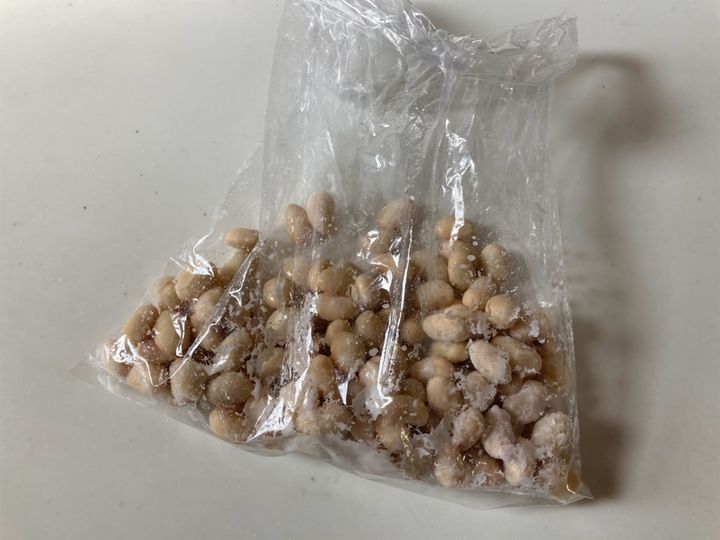 片栗粉と一緒にポリ袋へ入れ、大豆にまんべんなく片栗粉をまぶす。
