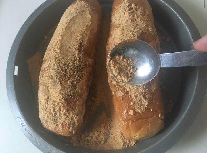 お皿に取り出し、揚げパンにきな粉と砂糖を混ぜ合わせたものをまぶせば完成。