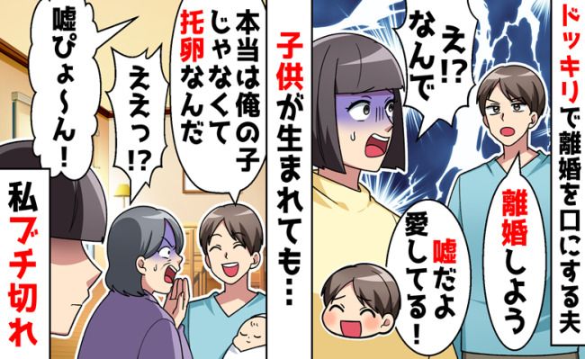 ドッキリ好きな夫。義母に「実は俺の子じゃない…ウソだよーん♡」シャレにならない冗談にキレた妻が
