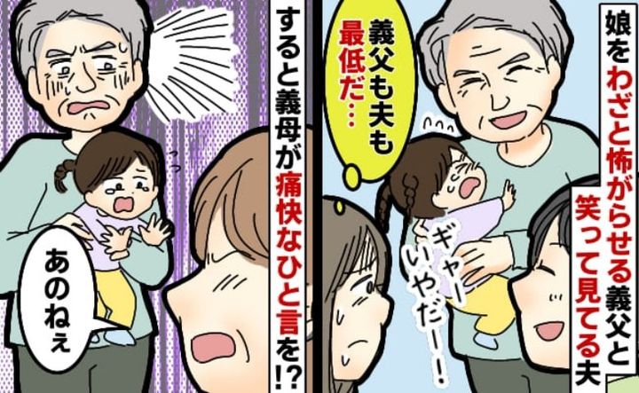 3. 「や、やめて…!」怯えるわが子をおもしろがって笑うお義父さんと旦那。2人が凍りついたのはお義母さんの鋭い一言だった…!