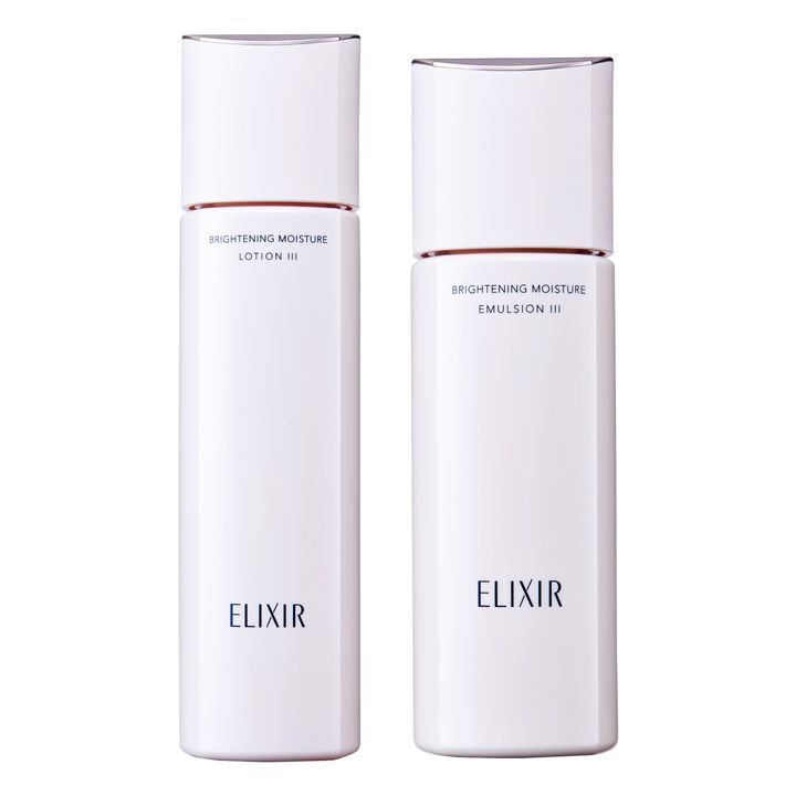エリクシールの薬用美白ラインのブライトニング ローションと乳液。潤いをしっかり保ってくれて透明感もアップ。時間をかけてハンドプレスしています。