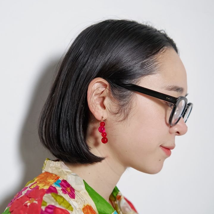 耳もとで揺れる鮮やかなピアスは麻絵さんのお手製。