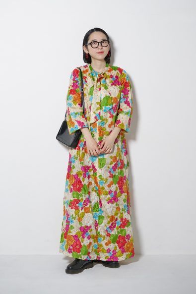 華やかなワンピースとマッチし、眼鏡とのコンビネーションで、ほんのりモード感も漂います。