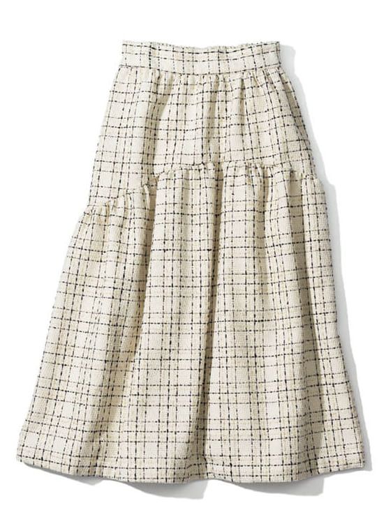 腰下のアシメ切り替えによる、表情のあるフレア感が魅力。細線のチェック柄もキュートなスカートは、フレッシュな春コーデの主役に適任です。
