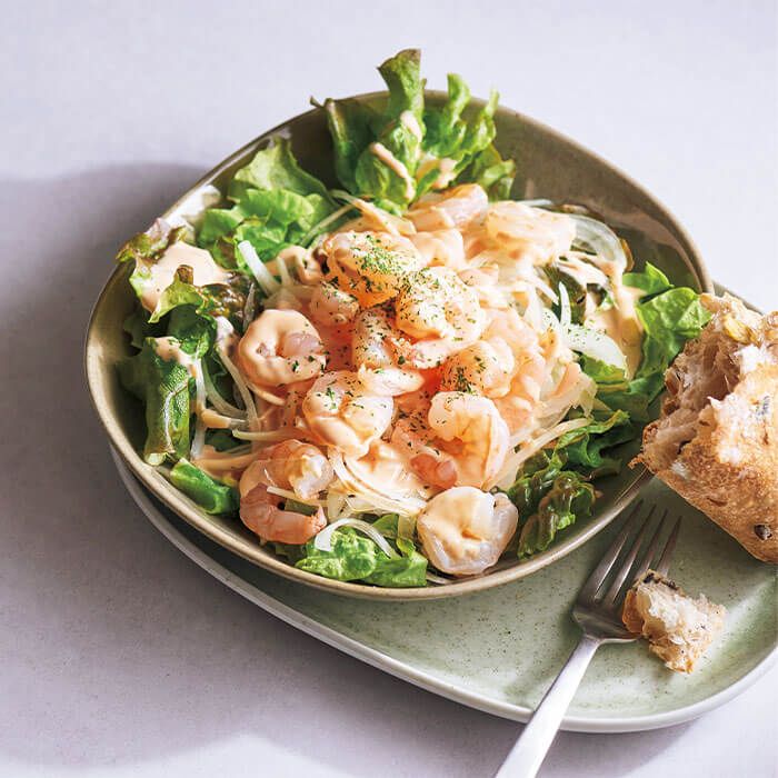 3. 器にサニーレタス、玉ねぎ、むきえびを順にのせて混ぜた「サウザンドレッシング」をかけ、パセリを散らす。