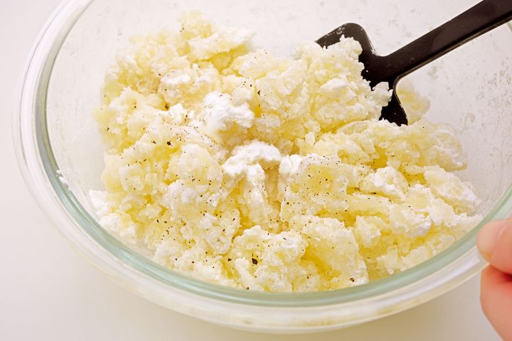 じゃがいもは皮をむいて、一口大に切る。さっと水洗いして水けをきり、耐熱のボールに入れる。ふんわりとラップをかけて電子レンジ(600W)で6分ほど柔らかくなるまで加熱し、マッシャーなどでつぶす。塩小さじ1/4、こしょう少々、片栗粉大さじ2を加えて混ぜる。