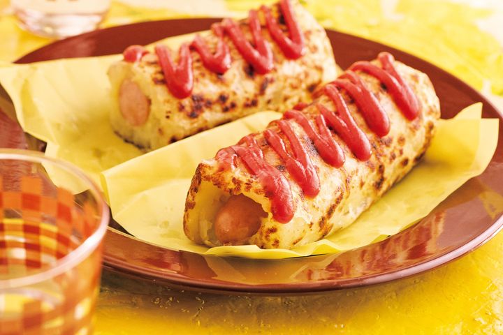 耐熱のゴムべらで手前の生地を奥側に寄せ、ウインナをしんにして奥から手前に向かって巻く。ころがしながら形を整える。残りも同様にする。器に盛り、トマトケチャップ適宜をかける。