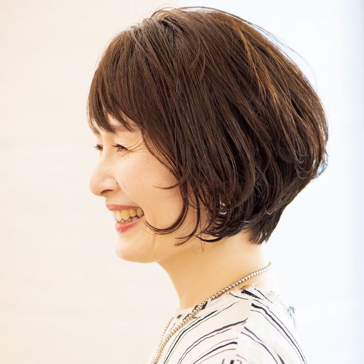 ぺたんとなりやすい方は、ふんわりとボリュームがあるようにも見えます。また、眉から目の上くらいの短さにカットするのも◎。目元の印象が際立ち、若々しい印象に仕上がります」