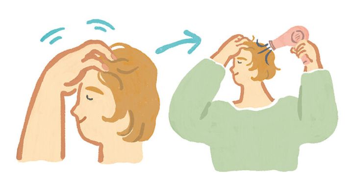 いつも同じ方向に分けていて、クセがあるという人は、手グシを入れて毛流れと逆方向に風を当てて乾かします。