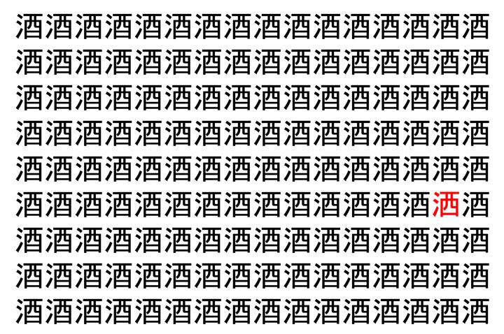 画像の中には、「酒」という漢字が縦に9行、横に16個並んでいます。 全部で144個となりますが・・・、そのうち1つは「異なる漢字」となってますよ!!
