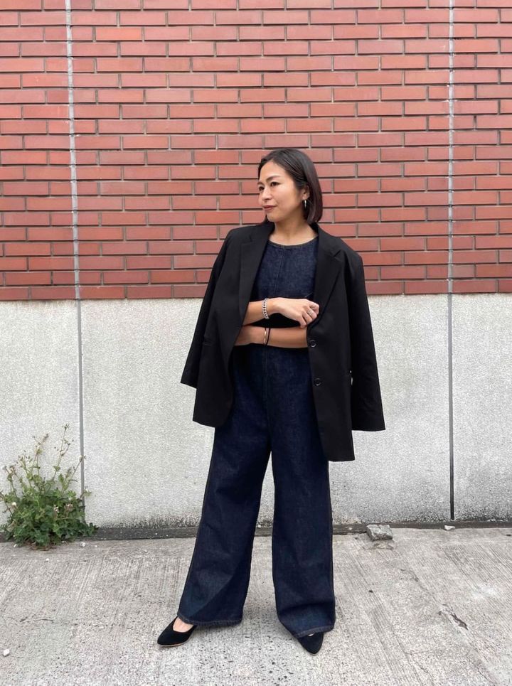 【スナップ】大人のデニムオールインワンはジャケット肩掛けで|鹿川智加さん