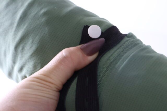 バンドの片端にボタンを取り付け、折りたたんだパーカーの上にバンドを固定して巻きます。