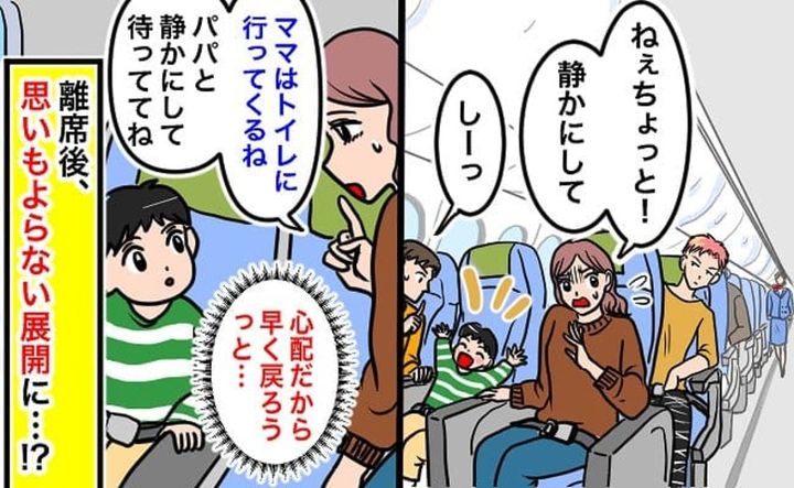 私たちが乗った座席の後ろには、派手めで少し怖そうな20代前半ぐらいの男性が座りました。離陸後、息子は少し興奮し、声も大きくなっていってしまい焦った私。大きな声を出す度に、私か夫が注意していました。途中、私はトイレに行きたくなり、席を離れました。息子には「静かにしているように」と言い聞かせて、席を立ちました。そしてできるだけ急いでトイレから席に戻ると……。