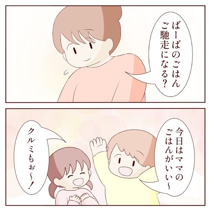 「ばーばのごはんご馳走になる?」チエミさんが子ども達にそう聞くと、「今日はママのごはんがいい~」「クルミもぉ~」コノハくんとクルミちゃんはそう答えると、