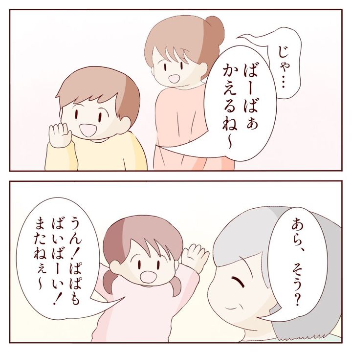 「じゃ・・」チエミさんが何かいいかけるのを遮って「ばーばぁかえるね~」とコノハくん。「あら、そう?」義母が優しく答えると、「うん!ぱぱもばいばーい!またねぇ~」クルミちゃんが義母だけでなく、マサヒコさんにもお別れの挨拶をしました。