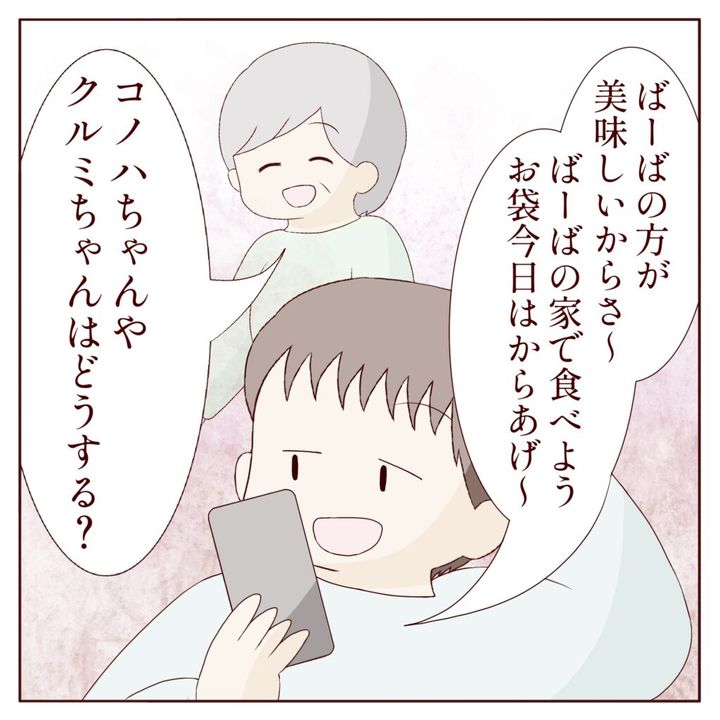 すると、「お夕飯一緒にどお?」義母がコノハくんとクルミちゃんに声をかけると、「今日はママがごはん作ってくれる~!」コノハくんがうれしそうに答えるのを見て、「あっ・・!」と慌てるチエミさん。
