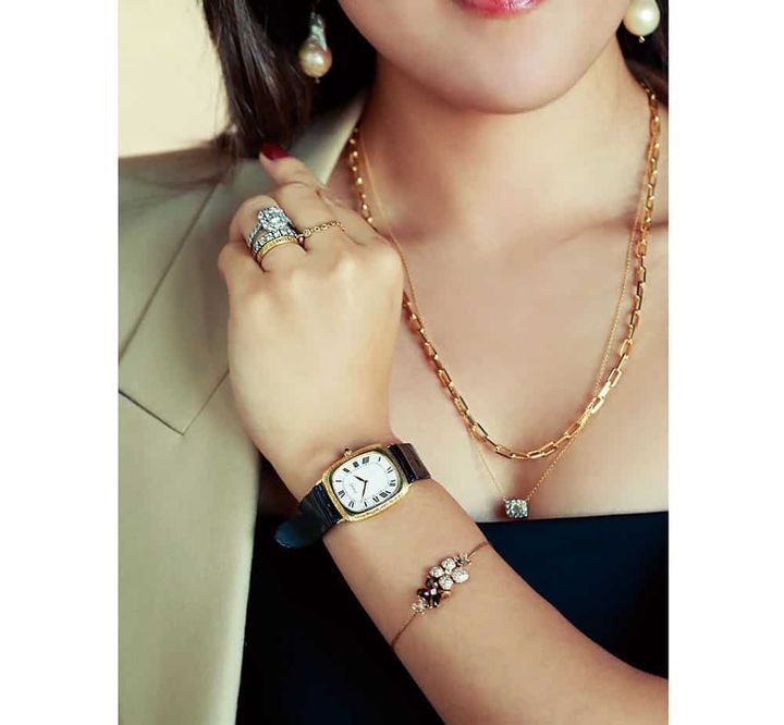 ウォッチはアンティークのピアジェ。最初は夫の時計選びに付き添ったのですが、私が一目惚れして復職のタイミングで手に入れました。日々使っているのはほぼこの1本です。ネックレスと右腕のブレスはカルティエのサントス、左腕のブレスはショーメ。リングは社会人1年目に手に入れたエルメス、服はドゥーズィエム クラスの黒のベアトップセットアップにサンローランのジャケットを合わせました。