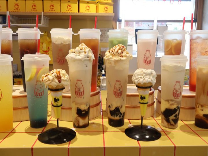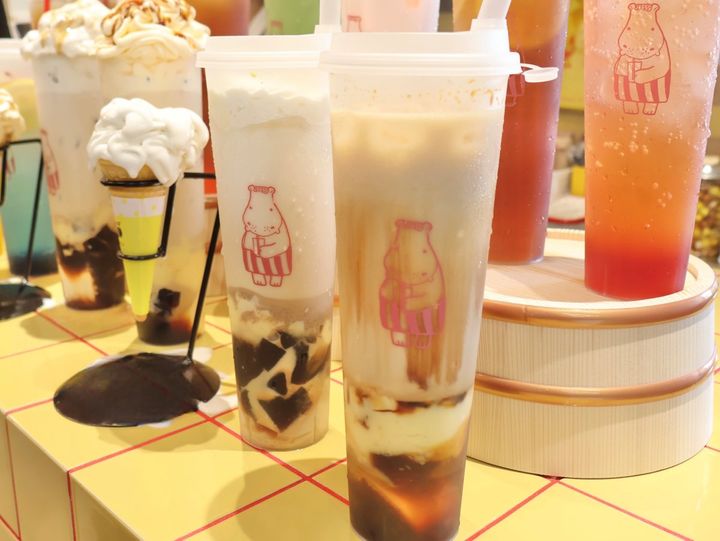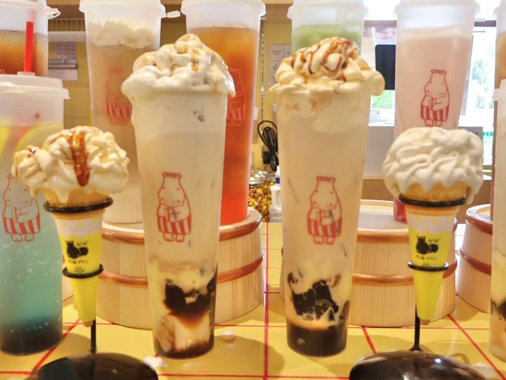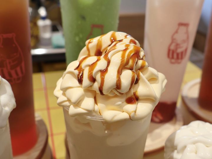 来宮駅店では、話題の“飲むプリン”が登場。なかでも、高さ20cm超えの「OOKUSU飲むプリン」は、インパクトも満足感も抜群の看板メニューです!