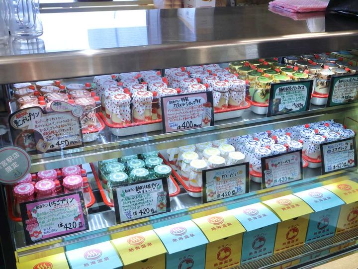 来宮駅店では、麦こがしプリンをはじめ、全7種類の熱海プリンがラインアップ。静岡抹茶を使った「静岡抹茶プリン」や、地元特産のだいだいを使った「風呂まーじゅプリンだいだい」など、バラエティ豊かなフレーバーがそろっています。
