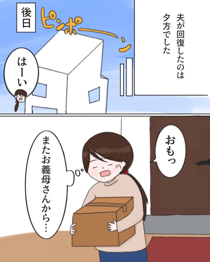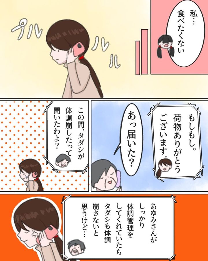 もともと食が細く、身体があまり丈夫ではないゆきは、やっぱり「私、食べたくない」と怖がってしまいました。でも御礼の電話だけはしておかなくては。「荷物ありがとうございます。」と伝えた私に「この間、タダシが体調崩したって聞いたわよ?あゆみさんがしっかり体調管理をしてくれていたらタダシも体調崩さないと思うけど・・・」と義母はまた嫌味を言ってきました。いやいやこの前の体調不良は・・・本当は言いたい気持ちをぐっと堪えました。