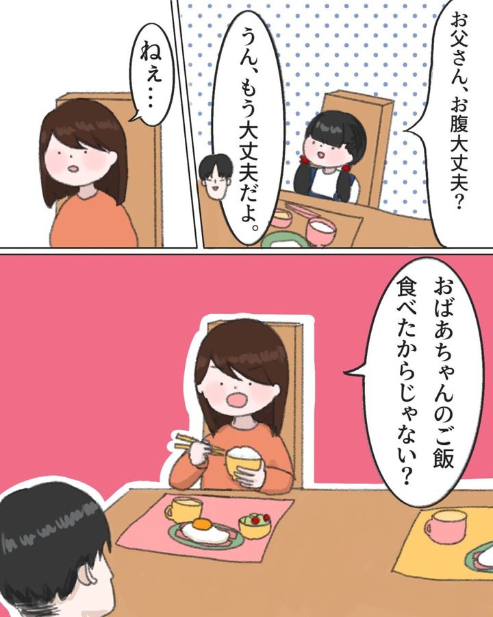 ゆきも夫のことを聞いて心配そうです。「うん、もう大丈夫だよ」とこたえる夫に、みかは「ねぇ、おばあちゃんのご飯食べたからじゃない?」とズバリ。私もそう思うけど言えなかったのに。娘は言えるんですよね、こういう状況で。