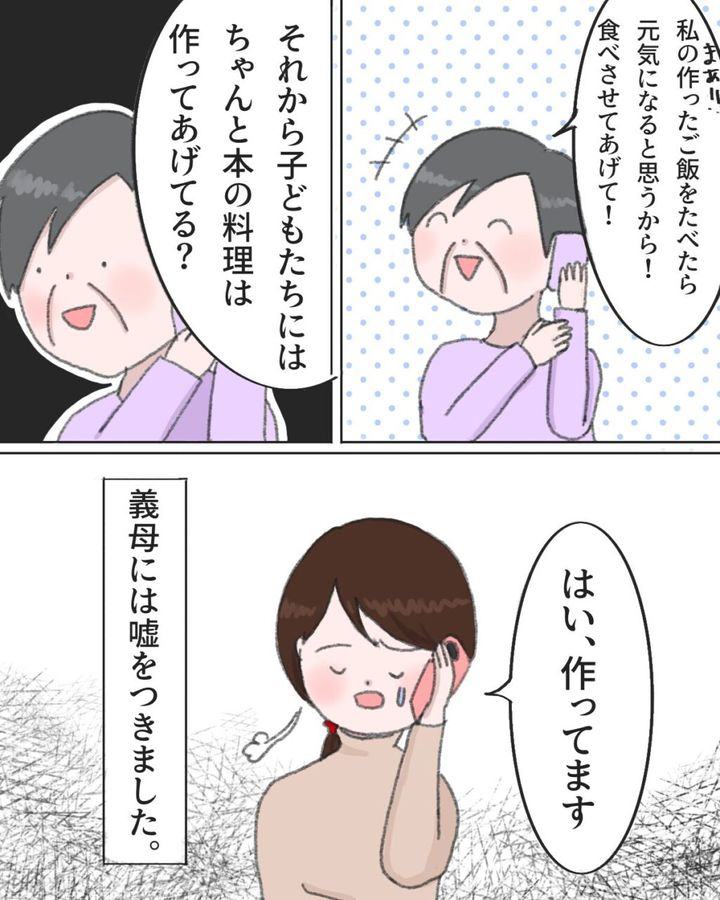 「私の作ったご飯を食べたら元気になると思うから!食べさせてあげて!」と義母はどこまでも自信満々です。「子どもたちにはちゃんと本の料理を作ってあげてる?」と聞かれ、「はい、作ってます」と嘘をつきました。