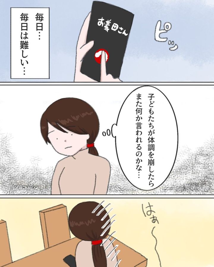 送られてきた本はとても勉強になる内容だとは思うけれど、毎日あの本から料理を作るのは難しい。でも、次に子どもたちが体調を崩したらまた何か言われるのかな。そう思うと憂鬱でした。
