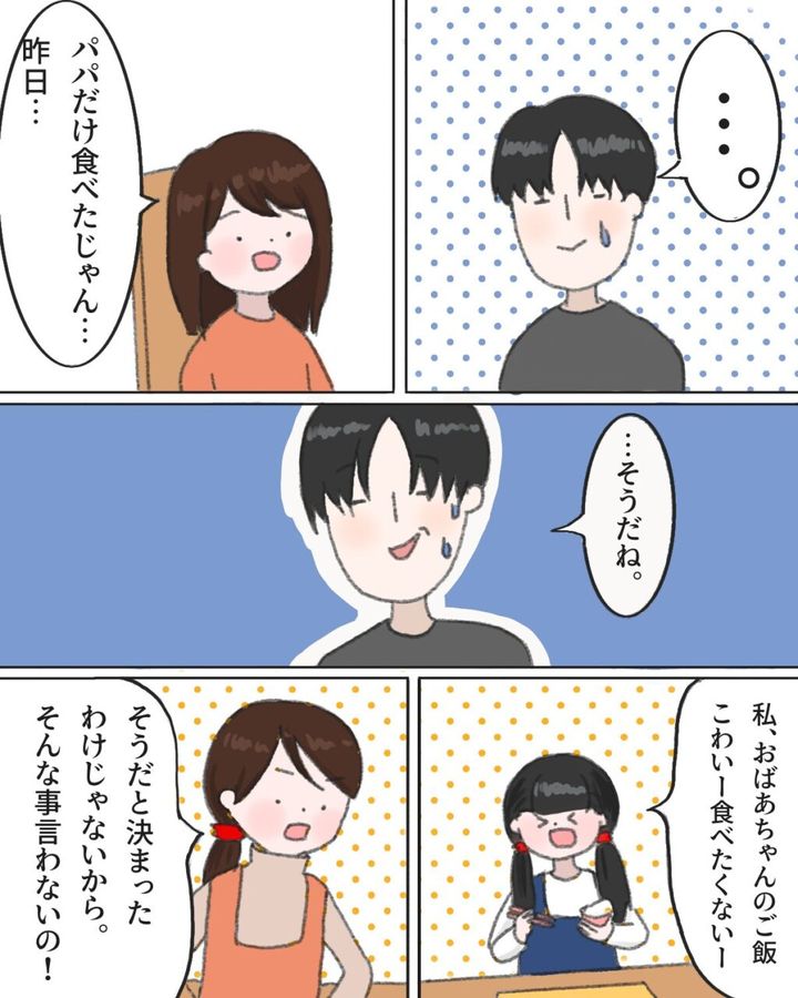 何とも言えず無言になった夫ですが、みかは「パパだけ食べたじゃん、昨日。」とさらに詰めるので「そうだね」と認めるしかない夫。そのやりとりを聞いていたゆきが「私、おばあちゃんのご飯怖い―食べたくないー」と言い出したので、「そうだと決まったわけじゃないから。そんな事言わないの!」と、母親としては言っておかなくてはなりませんでした。