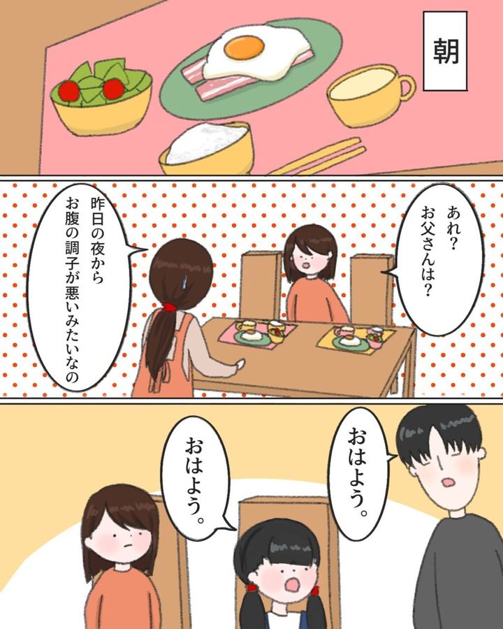 朝食の用意をしているところへみかが来て「あれ?お父さんは?」と聞くので「昨日の夜からお腹の調子が悪いみたいなの。」と説明していると、夫もやってきました。